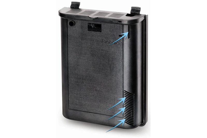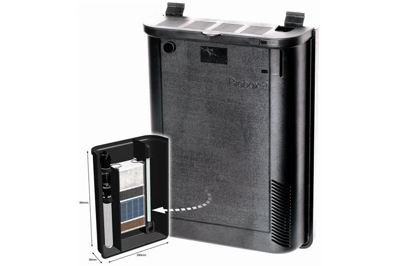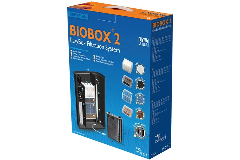 Der kompakte, schwarze Filterkasten (28x9x36.4cm) enthält eine Kreiselpumpe Easyflux, die für die nötige Umwälzung des Wassers sorgt, einen 200 Watt Heizstab Easyklim+ und wird mit den günstigen Easybox-Filtermedien bestückt. Er bietet Platz für 2x Größe L und 2x Größe S Medien die beliebig miteinander kombiniert werden können. Ausgeliefert wird das Filtersystem mit einem Grob- und einem Feinfilter sowie einem Modul mit Aktivkohle und einem Modul mit biologischem Filtermaterial.