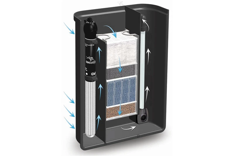 Mit diesem innovativen Innenfiltersystem haben Sie nur einen Technikartikel im Becken statt mehrere, die Medien lassen sich leicht zur Reinigung oder zum ersetzen entnehmen.